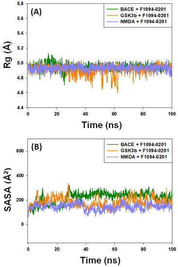 The radius of gyration measures the protein-ligand complex’s compactness, and the solvent-accessible surface area determines its exposure to solvent molecules. Each of these characteristics sheds light on the protein-ligand complex’s stability throughout the simulation [73]. In this study, the Rg of BACE, GSK3β, and NMDA was determined in the presence of F1094-0201 during 30–100 ns, as shown in Figure 7A. The Rg of BACE-F1094-0201, GSK3β-F1094-0201, and NMDA-F1094-0201 complexes varied in the range of 4.72–5.15 Å, 4.62–5.01 Å, and 4.79–5.06 Å, respectively, with an average value of 5.02 ± 0.07 Å, 4.88 ± 0.12 Å, and 4.94 ± 0.08 Å, respectively. Similarly, the SASA of BACE, GSK3β, and NMDA was determined in the presence of F1094-0201 during 30–100 ns (Figure 7B). The SASA of BACE-F1094-0201, GSK3β-F1094-0201, and NMDA-F1094-0201 complexes fluctuated in the range of 218.4–253.7 Å2, 104.2–271.8 Å2, and 93.7–202.6 Å2, respectively, with an average value of 272.5 ± 16.1 Å2, 201.7 ± 27.9 Å2, and 178.2 ± 20.4 Å2, respectively. These findings support the stability of protein-ligand complexes by showing that fluctuations in Rg and SASA of the protein of interest in the presence of F1094-0201 did not diverge significantly.