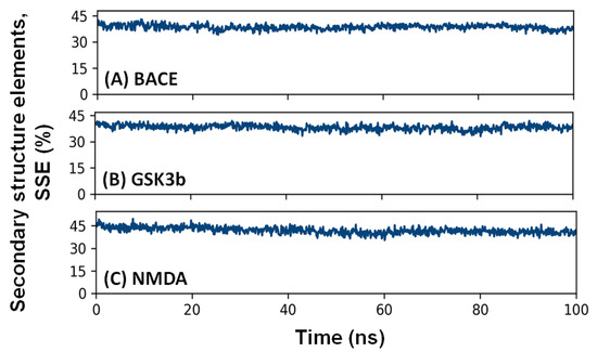 Monitoring the variations in a protein’s secondary structure elements (SSE) in a protein-ligand complex is significant for evaluating any structural changes in a protein due to ligand binding [74]. Here, we have evaluated the total SSE (α-helix + β-sheet) of BACE, GSK3β, and NMDA in the presence of F1094-0201 as a function of simulation time (Figure 8). The average SSE of BACE, GSK3β, and NMDA in complex with F1094-0201 was 38.56 ± 1.84% (α-helix = 5.57 ± 0.91% and β-sheet = 33.00 ± 2.22%), 38.11 ± 1.54% (α-helix = 22.09 ± 1.08% and β-sheet = 16.02 ± 1.87%), and 41.92 ± 2.56% (α-helix = 22.09 ± 1.37% and β-sheet = 19.84 ± 1.98%), respectively. The results indicate that the total SSE of all the targeted proteins in the presence of F1094-0201 did not undergo significant changes, thereby implying a stable protein conformation in the protein-ligand complex.