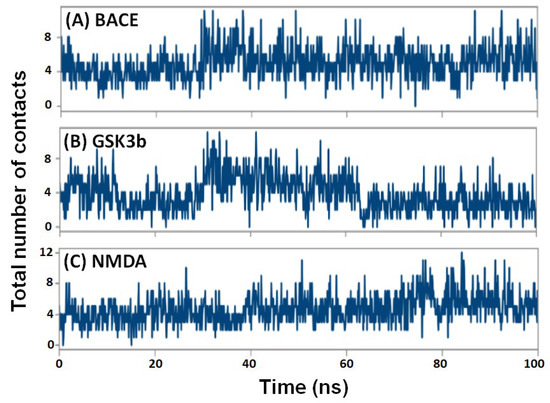 The total number of contacts formed between protein and ligand was also evaluated over the simulation (Figure 9). The total number of interactions between ligand and protein in BACE-F1094-0201, GSK3β-F1094-0201, and NMDA-F1094-0201 complexes varied in the range of 0–11, 0–11, and 0–12, respectively. During the 30–100 ns simulation, the average contacts between F1094-0201 and BACE, GSK3β, and NMDA were 7, 5, and 6, respectively.