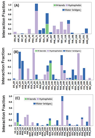 Further, the overall interaction pattern of F1094-0201 with BACE, GSK3β, and NDMA was also evaluated, as shown in Figure 10. BACE formed hydrophobic interactions with Tyr71, Lys107, Ile110, and Ile118, hydrogen bond with Trp76 for a significant simulation duration (Figure 10A). Similarly, GSK3β interacted with F1094-0201 through hydrophobic interactions with several catalytic amino acid residues (Ile62, Val70, Ala83, Leu132, Thr138, Tyr140, Gln185, and Leu188). F1094-0201 also formed a hydrogen bond with Tyr134 of GSK3β for a significant simulation duration (Figure 10B). Also, NMDA formed hydrophobic interactions with F1094-0201 through Phe16, Phe92, Tyr184, Phe185, Val227, and Ser248, and hydrogen bond with Arg131 (Figure 10C). These observations further emphasize that the F1094-0201 remained inside the binding pocket of target proteins and formed a stable protein-ligand complex.