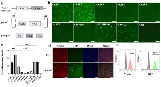 To find an rAAV serotype with high transduction efficiency for K-NSCs, nine kinds of rAAV serotypes with distinct capsids encoding green fluorescence protein (GFP), which generally applied in the pre-clinical research, were produced [23,29,30]. A schematic representation of the three plasmids used for rAAV generation is shown in Figure 2a. The pAAV-Rep/Cap and pHelper plasmids are necessary for rAAV packaging. A GFP-encoding sequence driven by a cytomegalovirus enhancer and chicken β-actin (CAG) promoter was inserted into the pAAV plasmid. Forty-eight hours post-infection with rAAV serotypes, the fluorescence intensity of GFP in K-NSCs was assessed by fluorescence microscopy. It was found that infection with the rAAV2-GFP vector resulted in abundant GFP expression at a multiplicity of infection (MOI) of 105, which demonstrated that the rAAV2 serotype effectively transduced K-NSCs (Figure 2b,c). Furthermore, we evaluated whether the undifferentiated state of K-NSCs was altered seven days after rAAV2 infection. Immunofluorescence staining and flow cytometry for Nestin, an NSC marker, showed that K-NSCs maintained the expression of Nestin, indicating that rAAV2-infected K-NSCs remained undifferentiated 1-week post infection (Figure 2d,e).