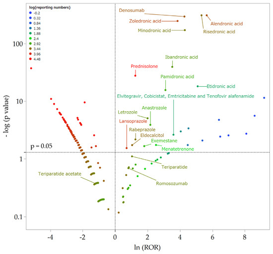 Volcano plot of drugs associated with AFF. The x-axis shows the natural logarithm of the odds ratios (ln (ROR)), while the y-axis shows the common logarithm of the inverse p-value (−log10 [p]) from Fisher’s exact test. The RORs were calculated using cross-tabulation. The dotted line on the y-axis represent p = 0.05. Plot colors represent the number of reports of adverse events. The red/green/blue points are common logarithms of the total reported numbers (range, −0.20 to 4.48). As the RORs become more positive, the tendency toward adverse events increases. Decreasing p-values indicate greater statistical significance. The upper-right portion of the plot identifies drugs that are more strongly associated with AFF.