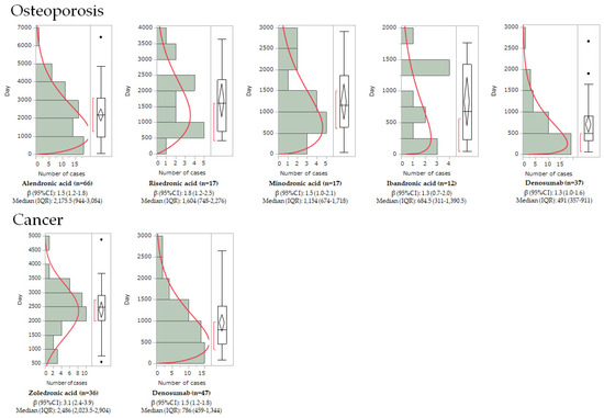 Time-to-onset analysis of BPs and denosumab in patients with osteoporosis and cancer. The y-axis indicates the days to onset, and the x-axis shows the number of reports (n). The left side of each graph is a histogram, while the right side is a box-and-whisker plot with outliers. The red line on the histogram was generated by fitting with a Weibull distribution.