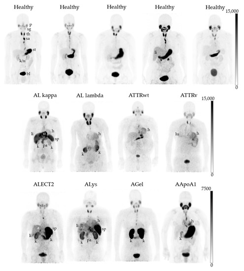 Biodistribution of 124I-p5+14 in healthy subjects and patients with diverse types of systemic amyloidosis. Maximum intensity projection PET images of healthy subjects (healthy) and patients with amyloidosis (immunoglobulin light chain kappa and lambda (ALκ and ALλ), transthyretin wild type and variant (ATTRwt and ATTRv), leukocyte chemotactic factor 2 (ALECT2), lysozyme (ALys), gelsolin (AGel), and apolipoprotein A1 (AApoA1)-associated amyloidoses). All subjects were administered 74 MBq (+/− 10%) I-124, and images were scaled to a minimum and maximum of 0–15,000 Bq/cc, except for the ALECT2 patient, who received 38.5 MBq, where the image is scaled to 7500 Bq/cc. For clarity, due to its atypical location, the stomach of the AL kappa patient has been labeled but does not indicate amyloid uptake in this organ. P: parotid gland; sg: salivary gland; th: thyroid gland; sa: saliva; st: stomach; k/u: kidney/ureter; bl: urinary bladder; h: heart, li: liver; sp: spleen; k: kidney; pa: pancreas; lu: lung; a: adrenal gland.