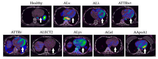 - Wagner, T.; Page, J.; Burniston, M.; Skillen, A.; Ross, J.C.; Manwani, R.; McCool, D.; Hawkins, P.N.; Wechalekar, A.D. Extracardiac (18)F-florbetapir imaging in patients with systemic amyloidosis: More than hearts and minds. Eur. J. Nucl. Med. Mol. Imaging 2018, 45, 1129–1138. [Google Scholar] [CrossRef]