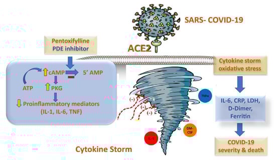 Several clinical interventions, including the IL-6-blocking drug tocilizumab, have been proposed to prevent or mitigate the severity of the cytokine storm [7]. There are no other therapeutic options that have been established up to this point for the purpose of mitigating the cytokine storm syndrome that is associated with COVID-19 in regular clinical research. Hence, phosphodiesterase (PDE-4) inhibitors such as theophylline and pentoxifylline are proposed as suitable COVID-19 therapeutic adjuvants [8,9,10].