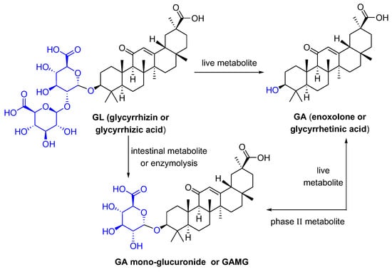 Glycyrrhizic acid (GL), a tetracyclic triterpenoid saponin, has a broad spectrum of biological activities [1], especially antiviral effects [2]. As shown in Figure 1, GL is composed of two molecules of glucuronic acid and one molecule of glycyrrhetinic acid (GA). GA, the aglycone of GL, is one of the active metabolites of GL under the action of gut commensal bacteria. GA is also one of active ingredients in licorice, and possesses extensive pharmacological activities such as anti-inflammatory [3], antioxidative [4], and antiviral effects [5]. GL can be metabolized in the intestine or be transformed via enzymolysis to glycyrrhetinic acid 3-O-mono-β-d-glucuronide (GAMG). GAMG, a distal glucuronic acid hydrolysate of GL, has a higher bioavailability and stronger physiological functions than GL, including antitumor, antiviral and anti-inflammatory activities [6,7]. In particular, GL and its metabolites have antiviral infection properties and improve symptoms caused by viral infections.