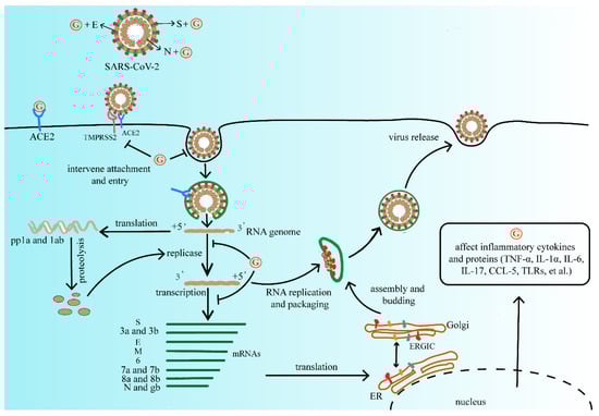 In addition, virtual screening showed that GL had the best affinity towards key proteases of SARS-CoV-2, which played a pivotal role in mediating viral replication and transcription [31,39]. It had been reported that GL and GA potentially inhibited SARS-CoV-2 infection, while revealing that the target of GL was the nsp7 protein, and GA binds to the spike protein of SARS-CoV-2 [40]. There are various reports on the antiviral mechanism of GL and its derivatives, but most studies focus on ACE2. Murch pointed out that GL and its metabolites directly inhibited of expression of TMPRSS2, which is related to virus entry, then reduced the expression of ACE2 [18].