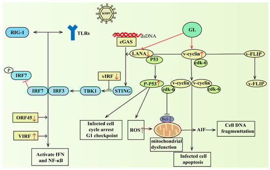The activation of any TLR would result in the production of interferon and the upregulation of cytokines and chemokines [111]. However, KSHV vIRF1 also inhibited IFN-induced gene functions, such as the TLR4 transcription and downregulation [112]. Recently, the cytoplasmic variant of LANA can directly bind to cGAS to inhibit the cGAS-STING DNA sensing pathway [113]. Members of the cytoplasmic DNA sensing pathway included cyclic GMP-AMP synthase and STING, and the cGAS-STING pathway seemed to be able to detect KSHV in the initial stage of infection and latency reactivation of multiple cell types [113,114]. Importantly, GL downregulates the expression of LANA-1. In this way, GL can indirectly attenuate the outer protein ORF45, block IRF7 phosphorylation and the activation of the type I IFN, and reduce the inhibitory effect of KSHV-encoded viral interferon regulatory factor (vIRF) on the activation of downstream IFN and NF-κB. GL downregulation of LANA-1 was related to changes in mitochondrial membrane potential, which transferred apoptosis-inducing factors (AIF) to the nucleus, causing DNA fragmentation and apoptosis. In addition, GL led to a higher phosphorylated (active) p53 content and cell cycle arrested at the G1 checkpoint. GL has the ability to promote the expression of cell cycle protein (v-cyclin), but has no effect on viral FLICE inhibitory protein (vFLIP). In short, GL reduced LANA levels, inhibited inflammation, induced interferon, activated p53, and increased ROS and mitochondrial dysfunction, resulting in KSHV-infected cells stopping proliferation, apoptosis, etc. Through this series of actions, GL can block virus reproduction and enhance immune resistance. Part of the mechanism of action of GL on KSHV is shown in Figure 3. Interfering with the replication of KSHV genes during the latent period and reducing the occurrence of induced tumors may have therapeutic significance for eliminating potential KSHV infection.