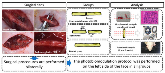 The methodology used in this experimental protocol was based on previous studies by our group on peripheral nerve regeneration, causing an injury to the buccal branch of the facial nerve in rats [37,38,83]. In these studies, it was proven that HFB has the capacity to allow the repair of the lesion with results similar to the gold standard of end-to-end neurorrhaphy, which uses suture thread [84,85]. In an unprecedented way, in the present study, we evaluated a protocol with a smaller number of PBM sessions and also the effects on facial muscles, through morphofunctional analysis.