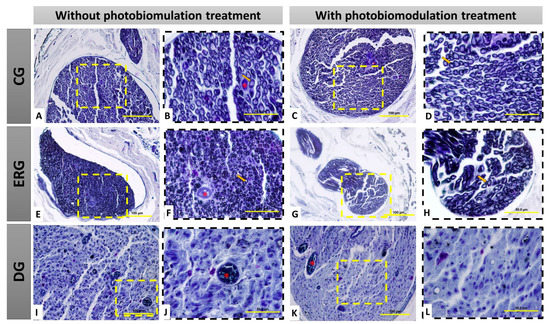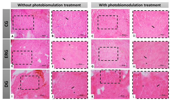Histological view of the facial muscles in cross-section demonstrating the morphology of the different groups, with or without treatment with photobiomodulation. In (A–D), at different magnifications of 20× (200 µm bar) and 40× (100 µm bar), we observe polygonal muscle fibers, with peripheral nuclei and fascicular organization. In (E–H), at different magnifications (20 and 40×), the groups that underwent denervation and immediate repair with HFB, demonstrating a good histological pattern with few morphological changes. In (I–L), at different magnifications of 20× (200 µm bar) and 40× (100 µm bar), the groups that underwent denervation and no surgical intervention was performed for nerve repair, demonstrate some morphological alterations resulting from this situation, dimensional reduction of the muscle fibers and connective tissue invasion. CG = Control group, ERG = Experimental repair group, DG = Denervated group. Black arrow = muscle cell nucleus; Asterisk (*) intramuscular connective tissue.