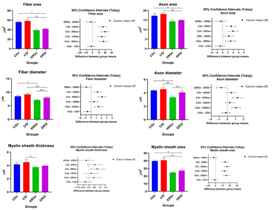 Regarding the diameter, CGn showed a significant difference with ERGn in nerve and axon fiber diameter measurements. In CGl we observe a significant difference in nervous fiber with experimental groups (ERGn and ERGl) and a significant difference with ERGN in axon diameter and myelin sheath thickness with ERGn.