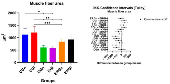 Mean and standard deviation of results of cross-section of muscle fibers and the difference between groups, demonstrated with mean and standard deviation column graph and standard deviation with the confidence intervals (Tukey). Asterisk (*, ** or ***) = significant difference between period/group (one-way ANOVA and Tukey, p < 0.05). CGn = Control group normal, CGl= Control group laser, DGn = Denervated group normal, DGl = Denervated group laser, ERGn = Experimental repair group normal, ERGl = Experimental repair group laser.