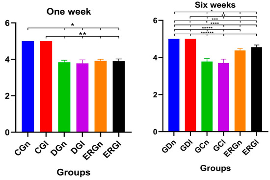 Functional results of vibrissae at 1 and 6 weeks postoperatively demonstrated with mean and standard deviation column graph. Asterisk (*, **, ***, ****, ***** or ******) = significant difference between period/group (one-way ANOVA and Tukey, p < 0.05). CGn = Control group normal, CGl = Control group laser, DGn = Denervated group normal, DGl = Denervated group laser, ERGn = Experimental repair group normal, ERGl = Experimental repair group laser.