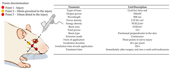The treatment began in the immediate postoperative period and continued for 5 weeks with a weekly application, always occurring on the same day of the week throughout the protocol. The animals were manually immobilized (delicate restraint) and sedation was unnecessary during the application of photobiomodulation. All study groups received the PBM protocol in the buccal branch of the facial nerve on the left side using the protocol using the low-level laser of gallium aluminum arsenide (GaAlAs)—Therapy XT DMC® (São Carlos, Brazil), with three application points along the path of the injured nerve, each point received an energy dose of 4 J, corresponding to 40 s per point, more details of the parameters are shown in Figure 7. Prior to the applications, the device was calibrated and tested to certify the dose.