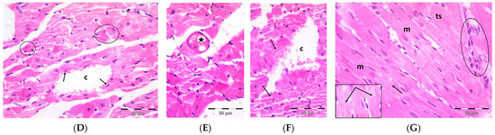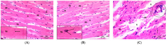 Formalin-fixed, paraffin-embedded heart tissue sections (5-µm thick) from the left ventricle were stained with H&E according to the standard procedure to study the structure of the cardiac muscle in each group [69].
