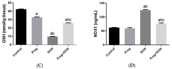 To investigate the effect of the DOX-induced upregulation of oxidative stress and its role in cardiac damage, we measured the myocardial content of malondialdehyde (MDA), a lipid peroxidation end-product; the total nitrite/nitrate (NOx) content, as an indicator of nitric oxide (•NO) metabolism; and reduced glutathione (GSH), as a marker of endogenous cardiac antioxidant capacity. Compared with the control groups (groups 1 and 2), the untreated DOX-challenged hearts in group 3 showed dramatic increases (p < 0.05) in MDA and NOx levels, which were accompanied by a substantial reduction (p < 0.05) in GSH levels (Figure 3). On the other hand, the cardiac tissues from the pregnenolone-treated DOX-intoxicated rats in group 4 showed normalized levels of MDA and were showed GSH levels closer to normal when compared with the DOX-treated group. Furthermore, when compared to rats in group 3 (untreated DOX rats, Figure 3C), their NOx concentrations significantly decreased after pregnenolone therapy. On the other hand, levels of NADPH oxidase 1 (NOX1), a ROS-generating enzyme, in cardiac tissue homogenates were measured. The pregnenolone-treated DOX-intoxicated rats in group 4 displayed almost normal NOX1 levels after their increase via DOX administration (Figure 3D).