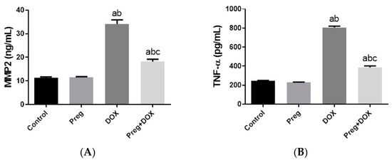 Expression of MMP2 (A) and TNF-α (B) in cardiomyocytes of rats after DOX and/or Preg administration. Results show the mean of six observations ± SEM. a,b,c Significant difference (p < 0.05) compared to control, Preg control, and DOX groups, respectively. MMP2: matrix metalloproteinase 2; TNF-α: tumor necrosis factor-alpha; Preg: pregnenolone; DOX: doxorubicin.