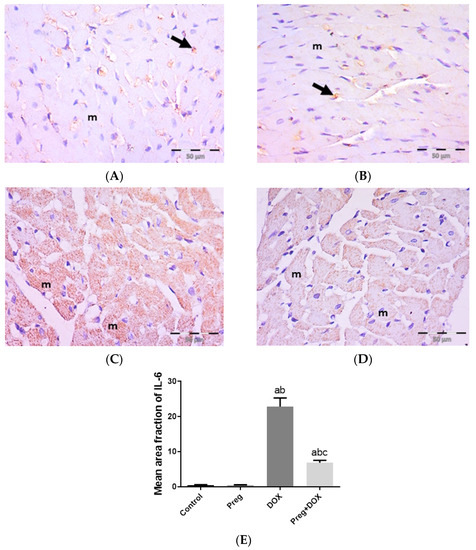 Representative immunohistochemical photomicrographs (×400) of left ventricular sections stained for IL-6, showing the following: control (A) and Preg-treated control (B) groups with negative myocyte expression (m). Notice non-specific reactions in intercellular spaces (arrows). The DOX-intoxicated group (C) shows strong positive IL-6 cytoplasmic expression in most myocytes (m). The Preg-treated DOX-intoxicated group (D) shows myocytes with faint IL-6 cytoplasmic expression (m). (E) Surface area fraction of IL-6 reactivity. Results are expressed as the mean ± SEM of 6 fields in each group. a,b,c Significant difference (p < 0.05) compared to control, Preg control, and DOX groups, respectively. IL6: interleukin 6; Preg: pregnenolone; DOX: doxorubicin.