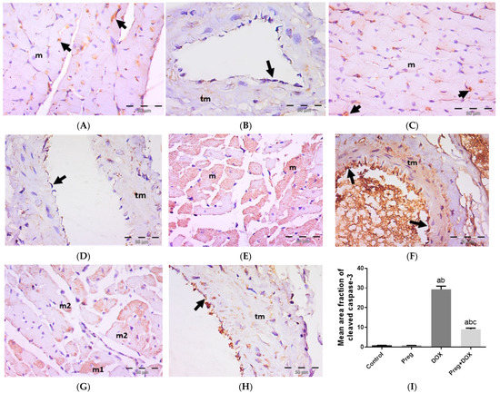 Representative immunohistochemical photomicrographs (×400) of left ventricular sections stained for cleaved caspase-3, showing control (A,B) and Preg-treated control (C,D) groups. (A,C) Negative expression in myocytes (m). Notice non-specific reactions in intercellular spaces (arrows). (B,D) Representing coronary vessels with negative expression in vascular endothelium (arrows) and tunica media (tm). The DOX-intoxicated group (E,F) shows positive cytoplasmic expression in most of the myocytes (m) (E), and vascular endothelium (arrows) and tunica media (tm) of coronary vessels (F). The pregnenolone-treated DOX-intoxicated group (G,H) showing (G) scattered myocytes with positive cleaved caspase-3 cytoplasmic expression occupying either the whole sarcoplasm (m1) or the subsarcolemmal sarcoplasm (m2). (H) Representing coronary vessels with positive expression in vascular endothelium (arrow). Notice minimal expression in tunica media (tm). (I) Surface area fraction of cleaved caspase-3 reactivity. Results are expressed as the mean ± SEM of 6 fields in each group. a,b,c Significant difference (p < 0.05) compared to control, Preg control, and DOX groups, respectively. Preg: pregnenolone; DOX: doxorubicin.