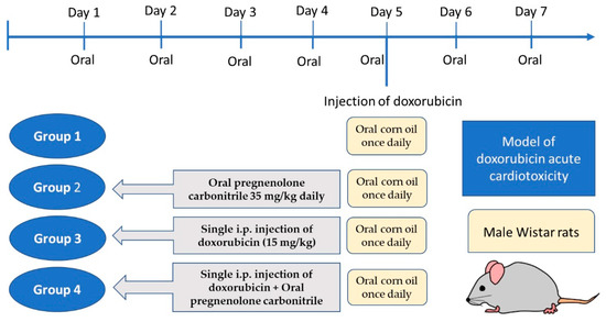 After acclimatization for one week, twenty-four rats were randomly divided into four groups (six rats each). Group 1 received oral corn oil once daily for seven days; group 2 received pregnenolone carbonitrile (Cas Number: 1434-54-4, Toronto Research Chemicals, Toronto, ON, Canada) as a single oral daily oral dose of 35 mg/kg dissolved in corn oil for seven days; group 3 received a single i.p. injection of DOX (15 mg/kg) on the fifth day of experiment, in addition to daily oral corn oil as in group 1; and group 4 received the combined treatment of pregnenolone and DOX, as described for groups 2 and 3, respectively (Figure 7). The DOX dose used in the current study was based on our pilot study and previous publications [37,38]. A short-term rat model receiving a high-dose DOX injection would be appropriate for assessing acute cardiotoxicity [62]. However, a limitation of the current study is that for the verification of myocardial damage, we used biochemical and histological markers but not echocardiography. The dose of pregnenolone carbonitrile was chosen according to a previous publication [63]. The dose of pregnenolone is safe as its LD50 is 100 mg/kg in rats, according to the safety data sheet. Moreover, its safety was approved via dose translation between laboratory rats and humans to predict the human equivalent dose [64].