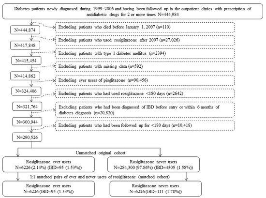 To our knowledge, there are scanty population-based studies investigating the potential role of antidiabetic drugs in the class of TZD in the prevention of IBD in humans. In our recent study, we found a null association between pioglitazone (the only TZD currently available in Taiwan) exposure and IBD risk in Taiwanese patients with type 2 diabetes mellitus [57]. Although rosiglitazone is not currently used in clinical practice in Taiwan, it remains a clinically important issue to look into the potential usefulness of rosiglitazone in the prevention of an intractable disease of IBD. In the present study, we investigated IBD risk with regard to rosiglitazone exposure in a cohort of patients with type 2 diabetes mellitus matched on propensity score by using the reimbursement database derived from the nationwide National Health Insurance (NHI) in Taiwan.