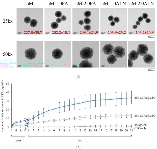 (a) TEM microstructure and the particle size distribution of drug-free nMBG (nM) and drug-impregnated nanoparticles (nM-1.0FA, nM-2.0FA, nM-1.0ALN, and nM-2.0ALN) in each group (n = 10); (b) Cumulative drug release of FA-impregnated nMBG@CPC composite as bone cement (n = 8).