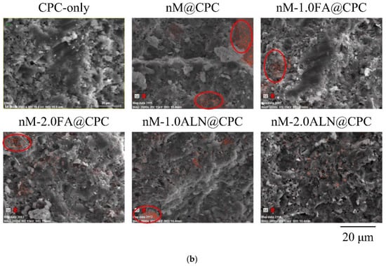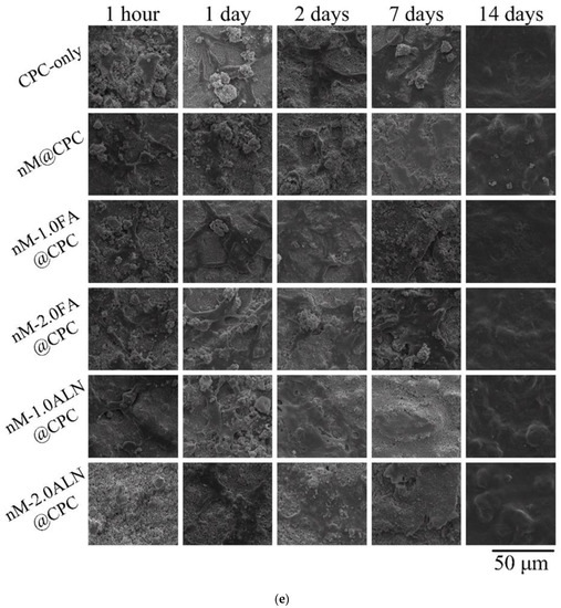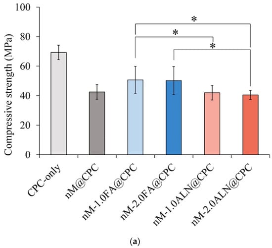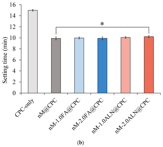The nMBG@CPC composites reduced the working and setting times, especially the working time because adding a small amount of nMBG could shorten the working time of CPC by absorbing the residual water molecules into the nMBG [28]. The working time of the ALN group was particularly longer than that of the other nMBG composite groups but shorter than that of CPC-only. In addition, the setting time of the nM-2.0ALN@CPC was the only group that significantly differed from that of the drug-free nM@CPC group because ALN has a high affinity for calcium ions, thereby prolonging the working time [29,30].
