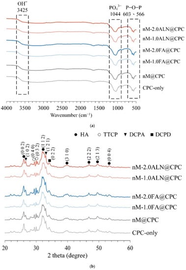 The proper additive of 5 wt.% nMBG in the CPC matrix was investigated based on our previous study and the literature [9,21]. The CPC-only composite was set as the control group, and nMBG@CPC composites consisting of CPC powder mixed with drug-free 5 wt.% nMBG were used for comparison. The 5 wt.% nMBG composites were impregnated with different concentrations of FA and ALN (designated as nM-1.0FA@CPC, nM-2.0FA@CPC, nM-1.0ALN@CPC, and nM-2.0ALN@CPC). The composite slurries were prepared by mixing the above MBG/CPC powder with 0.67 M phosphate hardening solution at a powder-to-liquid ratio of 1.0 g to 437.5 μL. The slurry was well mixed for 1 min and then pressed at 0.7 MPa (100 psi) into a cylindrical sample with a height × diameter of 12 × 6 mm. The sample was left to set for 3 min before demolding. Physical and chemical properties were then evaluated.