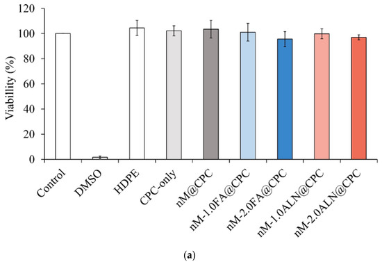 Neonatal mouse fibroblast L929 cell line was purchased from the National Institutes of Health, Miaoli, Taiwan for cytotoxicity assays according to ISO 10993-5:2009. Cell culture followed protocol in Minimal Essential Medium alpha medium (Gibco, Thermo Fisher Scientific Inc., Waltham, MA, USA) supplemented with 10% horse serum. The medium was changed every 2 days during the experiment. The samples were sterilized by autoclaving at 121 °C and 1.05 kg/cm2 (15–20 psi; TOMIN, TM-328, Taipei, Taiwan). The ratio of extract to medium for composite samples was 1 g/5 mL. Cells were cultured in the extracted medium for cytotoxicity assays and incubated for 24 h in a 37 °C incubator. The negative control used was high-density polyethylene (HDPE), and the positive control was 15 vol.% dimethylsulfoxide (DMSO; Sigma-Aldrich, St. Louis, MO, USA) for comparison with extracts from composites to ensure the validity of the test.