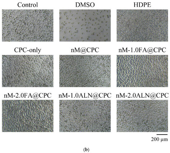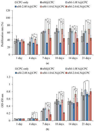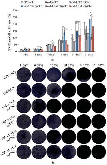 The cell proliferation compared with the blank group is shown in Figure 7a. Overall, the cell viability increased over time and remained stable at day 10, indicating that D1 progenitors entered the mineralization. Based on cell proliferation on the 7th day, the nM-2.0FA@CPC and nM-2.0ALN@CPC groups with high drug concentrations had significantly lower cell viability than the other groups, confirming that high concentrations of FA or ALN were not conducive to the proliferation of D1 progenitor cells. In addition, the cells in the CPC@nM-2.0FA group did not proliferate significantly after 1 day. The FA release concentration of CPC@nM-2.0FA on the 4th day exceeded the release concentration of CPC@nM-1.0 on the 21st day. The drug concentration released by CPC@nM-2.0FA on the 1st day was not conducive to cell proliferation. However, the two drugs had a slight difference in terms of the lower concentration of cell viability at day 21 than in the drug-free nM@CPC control. Overall, FA and ALN still had positive effects on cell proliferation at appropriate low concentrations.