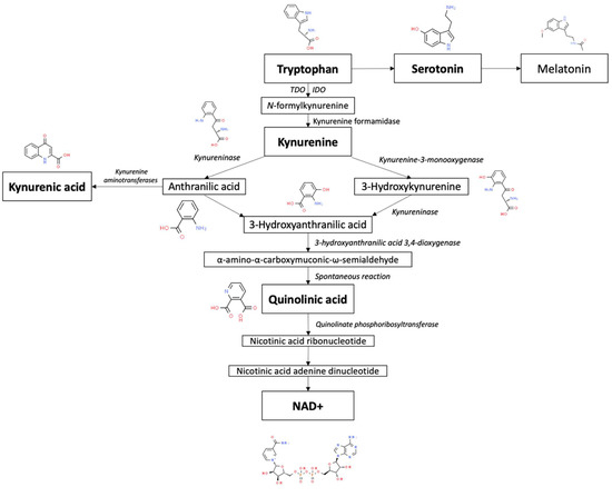 Overview of tryptophan metabolism via the kynurenine pathway. Chemical pictures from the Royal Society of Chemistry. www.chemspider.com. Accessed on 20 April 2023.