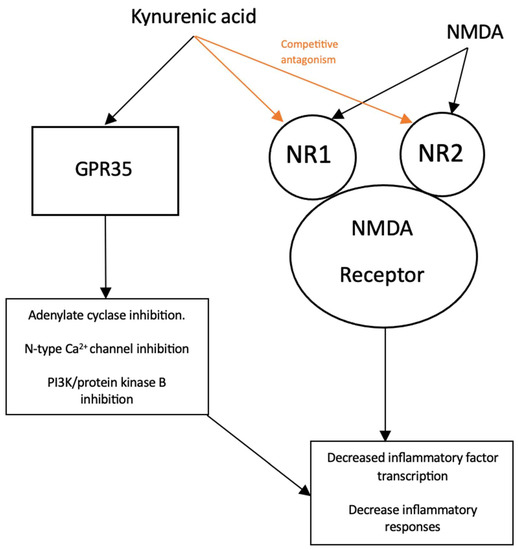 - Wirthgen, E.; Hoeflich, A.; Rebl, A.; Gunther, J. Kynurenic Acid: The Janus-Faced Role of an Immunomodulatory Tryptophan Metabolite and Its Link to Pathological Conditions. Front. Immunol. 2017, 8, 1957. [Google Scholar] [CrossRef]
