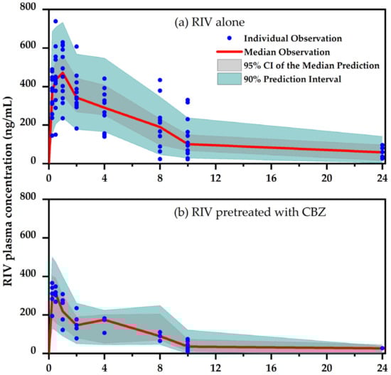 Pharmacokinetics of RIV in rats and visual prediction check for the developed PopPK model of RIV; (a) control group (RIV alone) and (b) test group (RIV administered with CBZ). This figure has been redrawn from our previous study result [24].