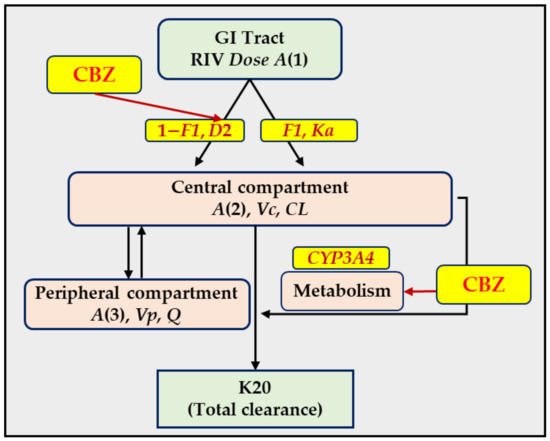Schematic representation of the PopPK model for RIV and strategies to investigate the effect of CBZ on the PK of RIV. Notations are described in Table 1. This figure has been redrawn from the figure published in our previous study [24].
