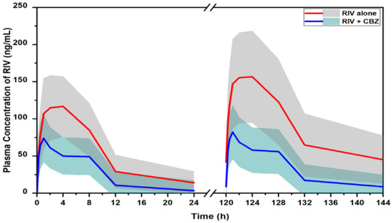 In a previous study, our team developed a PBPK model for RIV in humans. In that model, the metabolic degradation by CYP3A4, CYP2J2, and non-CYP enzymes, and the active transportation by Pgp/BCRP, were implemented [17]. To perform the simulation for the DDI profile of RIV and CBZ, the PBPK model for RIV was paired with a previously developed PBPK model for CBZ extracted from the OSP Library [26,27]. The simulation results from the PBPK model-based approach are listed in Table 2, indicating that CBZ significantly reduced the exposure of RIV. The AUCs of RIV were reduced by 35.2% (from 2221.3 to 1438.7 ng · h/mL) and by 25.5% (from 2467.3 to 1838.4 ng · h/mL) after the first dose and at the steady state, respectively. The Cmax of RIV were reduced by 37.7% (from 266.3 to 166.1 ng/mL) and 36.4% (from 282.3 to 179.5 ng/mL), respectively.