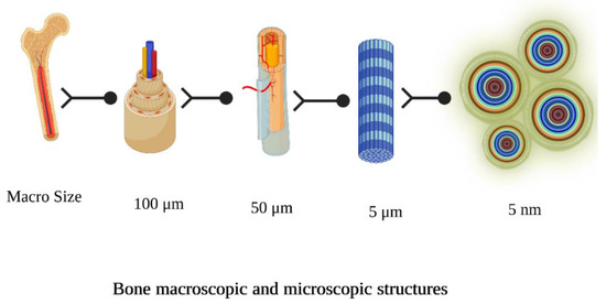 Scaffold materials should be osteoconductors, promoting bone-forming cells and preserving neo-vascularization that will provide nutrition to the new cellular environment, and osteoinducers, delivering biologically active compounds gradually that induce stem cells to specialize and accumulate calcified tissues [14]. Furthermore, the tightly controlled structure of osteons in the natural bone architecture shows that cell quantity, source, and gap are crucial for scaffolding architecture and fabrication. Figure 1 shows the macroscopic and microscopic structure of bone [16].