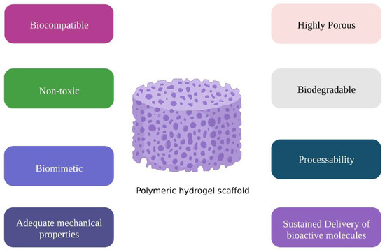 Hydrogels have gained popularity in medical applications, because they are biocompatible, biodegradable, resemble the ECM (extracellular matrix) architecture, and easy to use in practice [27]. Given the advancement of personalized medicine, there is a growing necessity to produce hydrogels to transport biological substances, eliminating the need for open surgery and enabling from minimally invasive techniques to biomaterial and cell application [28]. Scaffolds should be economic to allow their massive clinical application. Figure 2 shows the requirements of tissue engineering scaffold [29].