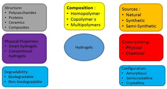 Hydrogels are the most commonly studied scaffolds and are categorized into origin, configuration methods of crosslinking, polymeric composition, form; Figure 3 shows the classification of hydrogels [44].
