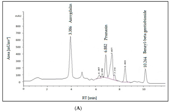 The result of the determination of glycosides using HPLC showed the presence of the glycosides: amygdalin, prunasin, and benzyl-beta gentiobioside. All of these components appeared as follows for retention time: 3.386, 6.882, and 10.624 min, respectively. Amygdalin had the highest percentage (24.768 mg/mL), followed by prunasin (8.783 mg/mL) while benzyl-beta gentiobioside had the lowest (5.959 mg/mL). Two minor compounds, prunasin, and benzyl-beta gentiobioside, were identified along with the primary glycoside, amygdalin, and they were characterized as mandelic acid glycosides. The anti-tumor encouraging activity of these compounds was examined in both in vitro as well as in vivo assays. All the components had significant inhibition, and the Epstein-Barr virus early antigen stimulation was induced by the tumor promoter [25,26].