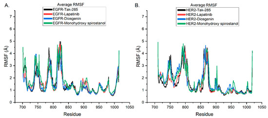 Comparison of the average RMSF values of EGFR and HER2 complexes with tak-285 (black), lapatinib (raspberry), diosgenin (sapphire), and monohydroxy spirostanol (fern). (A) RMSF values of EGFR complexes. (B) RMSF values of HER2 complexes.