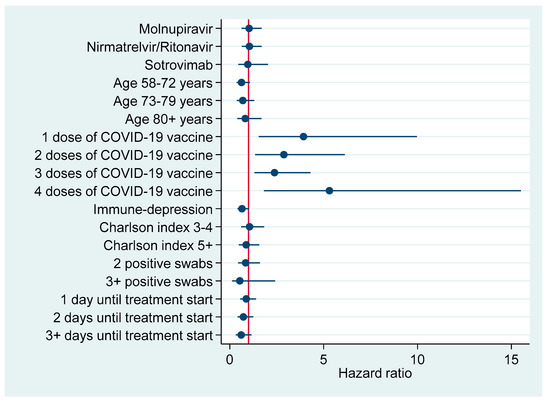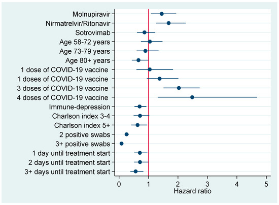 In Model 2, restricting the analysis to patients turning negative 5–9 days after COVID-19 diagnosis, the effect of the two antivirals vanished, whereas the vaccination’s effect was reinforced for any dose number, particularly four (aHR = 5.55; 95% CI: 1.58; 19.45), although the estimates for the booster did not reach statistical significance (Table 7).