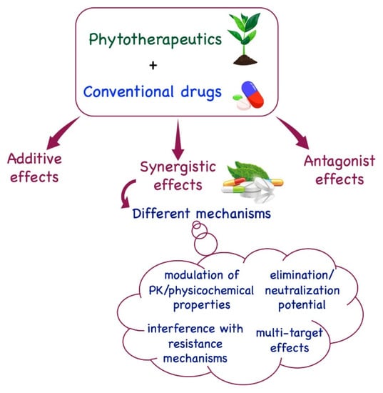 In any case, it is noteworthy that the most common mechanisms described in the literature are synergistic multitarget effects [2]. In recent years, the synergistic effects between phytotherapeutics and conventional drugs have been described in different areas of therapy, based on the mechanisms described above, and many of the commonly employed drugs are based on the synergistic interactions with plant derivatives. For instance, synergistic drug combinations have been envisaged as a promising approach for antimicrobials, with different combinations described as promoters of reducing the minimum inhibitory concentrations of antibiotics for different bacterial strains. Indeed, a promising approach to hinder drug resistance is searching for new and alternative sources of antibacterial molecules that may block the bacterial growth via different mechanisms with respect to the antibiotics that are currently in use, reinforcing the efficacy against drug-resistant microorganisms [17,18,19,20,21,22]. Furthermore, beneficial associations between conventional chemotherapeutic agents and plant derivatives have been described in the field of anticancer research, both as preventive approaches and targeted-oriented strategies [2,23,24], thanks mainly to the synergistic effects lying in the resistance mechanisms, such as the capability of natural bioactives to antagonize drug resistance, enhance drug properties, or mitigate possible side effects, as mentioned above.