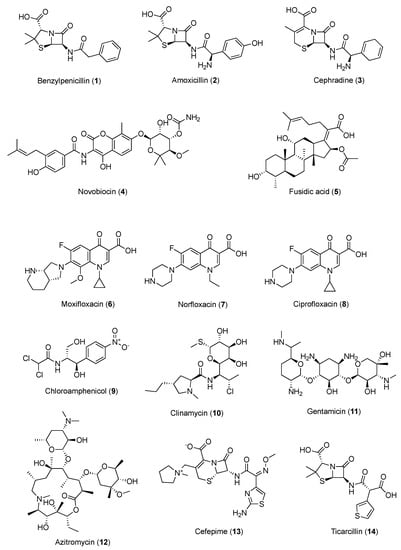The in vitro potential of caffeine to modify the antibacterial properties of well-established antibiotics was examined, representing diverse classes with distinct antimicrobial mechanisms, and various trends could be observed within drug families. Considering Staphylococcus aureus, while no significant effect of caffeine was reported against the strain Mu, a slight improvement in drug activity was observed in the S. aureus Newman strain when penicillins, carboxypenicillins, and most cephalosporins were used in combination with caffeine, but there was no effect with ampicillins. In particular, the MIC of benzylpenicillin (1, Figure 3 vs. S. aureus was enhanced by 59 and 40 times with caffeine at concentrations of 5 and 10 mg/mL, respectively, whereas higher concentrations showed no inhibition of the S. aureus growth. At the same concentrations, caffeine reduced the MIC of amoxicillin (2, Figure 3) vs. S. aureus by 22 and 25 times, respectively, whereas that of ampicillin was lowered by 6 and 8 times, respectively [54]. The underlying mechanism of this antimicrobial synergistic interaction is not yet clear. It was hypothesized that the inhibition of bacterial cell walls by penicillins might ease the penetration of caffeine into the bacterial cells, causing a higher concentration of caffeine in the cells and, thus, enhancing the DNA damage [55]. Nonetheless, the synergistic effect may also be due to the inhibition of the Staphylococcus penicillinase enzyme, which increases the activity of the penicillinase-sensitive antibiotics. Moreover, the relationship between the polarity of the antibiotics and the effects of caffeine co-administration was also examined. Caffeine seemed to decrease the antibacterial potential of the less polar antibiotics while enhancing that of the more polar ones, probably due to the effect on the physicochemical interaction between caffeine and the drugs in vitro. Conversely, complexation with caffeine through the establishment of van der Waals interactions might reduce the in vitro activity of the less polar antibiotics. Subsequently, against the same S. aureus Newman strain, the association of cephradine (3) and caffeine resulted in a stronger inhibition, and the activity of cefotaxime and cefepime increased in a moderate manner. Bacitracin, vancomycin, and colistin seemed not to be influenced by caffeine, while aminoglycosides, macrolides, and novobiocin (4, Figure 3) exerted a significant potentiation of anti-staphylococcal activity in the presence of caffeine. No modulatory action of caffeine was found with fusidic acid (5, Figure 3) and tetracyclines [56]. In general, with regard to other pathogens, caffeine seemed to considerably inhibit the antibacterial activity of fluoroquinolones such as moxifloxacin (6), norfloxacin (7), and ciprofloxacin (8), as well as that of chloramphenicol (9) and clindamycin (10) (Figure 3) [57,58]. Considering that the antibacterial activity of the fluoroquinolones stemming from the inhibition of bacterial gyrase and topoisomerase IV, the inhibitory effects of caffeine against these drugs can be ascribed to caffeine’s potential to influence the biological activity of molecules that are able to direct covalent [59] or noncovalent [60] interactions with DNA, and which exert their effects through DNA-related enzymes involved in DNA synthesis or maintenance. Similarly, the inhibitory effects of caffeine on aromatic chloramphenicol might be explained by the potential of caffeine to reduce the bioavailability of aromatic compounds, blocking them in noncovalent stacking complexes [61]. When gentamycin (11), azithromycin (12), cefepime (13), novobiocin, and ticarcillin (14) (Figure 3) were selected for the evaluation of the possible effects of caffeine association on highly relevant human bacterial pathogens—such as S. aureus MSSA ATCC 25923 and MRSA 43300 strains, P. aeruginosa ATCC 27853, A. baumannii ATCC 19606, and K. pneumoniae ATCC 700603—the caffeine enhancement effects were proven to vary according to the pathogens evaluated. Altogether, the strongest increase in the antibacterial activity induced by caffeine was reported vs. the S. aureus MRSA strain, P. aeruginosa, and A. baumannii, while modest effects on the selected antibiotics were observed for S. aureus MSSA and K. pneumoniae. Among these antibiotics, the effect of caffeine was the greatest for cefepime and azithromycin, while the weakest was for novobiocin. Additionally, synergistic effects of caffeine for at least one bacterium were reported for all antibiotics tested, except for ticarcillin. Overall, low concentrations of caffeine (≥1 mg/mL) considerably diminished the MIC of the preselected antibiotics [56].