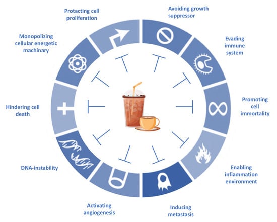 Coffee components target the hallmarks of cancer, according to Hanahan and Weinberg’s hallmarks of cancer (2011), with modifications.