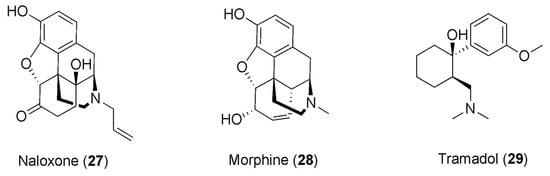 As stated in the previous paragraph, caffeine has been reported for its capability of enlarging the pain-relieving response to NSAIDs, giving rise to the application of caffeine as an analgesic adjuvant in combination with NSAIDs. Furthermore, it has been observed that by co-administering the opioid antagonist naloxone (27, Figure 7) with a combination of the NSAID diclofenac and caffeine, an 84% decrease in the anti-nociceptive effect is accomplished. This could denote a great contribution of opioids in the anti-nociceptive synergistic effect of caffeine with the NSAIDs [91].