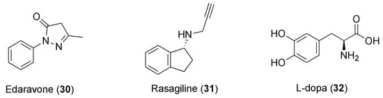Caffeine consumption elicits beneficiary psychostimulants that have also been associated with a reduced risk of developing Parkinson’s disease (PD) [108]. PD is one of the most frequent neurodegenerative diseases, for which there is currently no cure. It affects more than 1% of the elderly population. Notably, the manipulation of adenosine neurotransmission is recognized as one of the most interesting therapeutic approaches to this disease [109]. This alkaloid was studied in combination with edaravone (30, Figure 8) in a chronic rotenone-induced rat model of PD. Rotenone modifies the mitochondrial electron transport chain leading to the generation of ROS, which represents one of the major causes of PD, and its chronic administration is broadly utilized to produce laboratory models of PD. Edaravone is a potent free-radical scavenger, and a three-week treatment with edaravone in combination with caffeine can decrease rotenone-induced oxidative cell stress, muscle weakness, and cognitive impairment. The effect was more notable compared to the group solely treated with edaravone, showing a marked synergistic effect. This could be explained by edaravone’s scavenging of the peroxynitrite free radical. Increased levels of the protein nitroxidation marker 3-NT (3-nitrotyrosine) were detected in the group of animals that were only exposed to rotenone, whereas the concentrations of 3-NT in the control and association-treated group were similar. The combination also re-established memory and muscle strength by combating the effects of the rotenone. Hence, this association could be used for the management of PD in humans—alone or in combination with the currently available pharmacotherapeutic options—after significant clinical data become available [110]. Furthermore, caffeine was also evaluated in combination with rasagiline (31, Figure 8) and L-dopa (32, Figure 8), for the purpose of verifying the synergistic neuroprotective effects of co-administration against paraquat (PQ)-induced PD in mice.