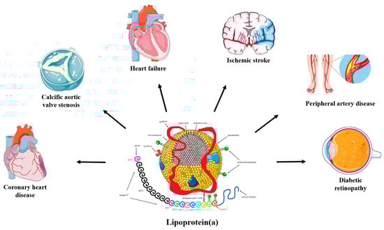 Lp(a) is a well-recognized, independent risk factor for atherosclerotic cardiovascular disease (ASCVD) [8,9]. Evidence from experimental, observational, and genetic studies has demonstrated that increased Lp(a) is associated with increased risk for coronary heart disease (CHD), ischemic stroke, peripheral artery disease, heart failure, calcific aortic valve stenosis (CAVS), mitral valve stenosis, and possibly retinopathy in diabetic patients [1,10,11,12,13,14,15,16,17,18] (Figure 1). On the contrary, elevated Lp(a) concentrations do not appear to be a risk factor for venous thromboembolism [7,8], as previously considered, whereas very low Lp(a) levels have been linked to an increased risk of incident type 2 diabetes mellitus (T2DM) [19].