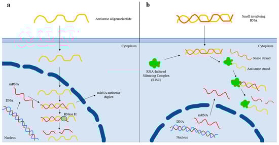 Mechanism of action of antisense oligonucleotide and small interfering RNA-based therapies. (a) After entering the nucleus, the antisense oligonucleotide (ASO) binds to the complementary sequence of the targeted mRNA. The resulting mRNA antisense duplex is recognized by RNase H, which cleaves the mRNA and, thus, prevents protein translation. (b) After the small interfering RNA (siRNA) enters the cell, it is recognized by the RNA-Induced Silencing Complex (RISC), which removes the sense strand. The resulting complex binds to the complementary mRNA sequence and degrades it, thus preventing protein translation. The antisense strand bound to the RISC forms a recyclable, stable complex, and, as a result, its action against target mRNA strands can be repeated. Thereby, less-frequent dosing of siRNAs is needed compared to that of ASOs.