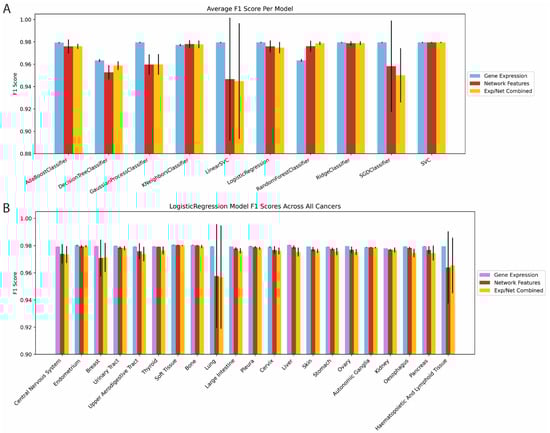 Baseline Accuracy Characterization. (A) F1 accuracy across different machine learning algorithms using gene expression, network features, and both combined. (B) F1 accuracy metrics in cancer-specific logistic regression models using gene expression, network features, and both combined.